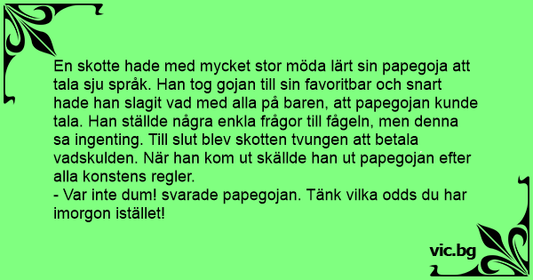En skotte hade med mycket stor möda lärt sin papegoja att tala sju språk. Han tog gojan till sin favoritbar och snart hade han slagit vad med alla på baren, att papegojan kunde tala. Han ställde några enkla frågor till fågeln, men denna sa ingenting. Till sluт blev skotten tvungen att betala vadskulden. När han kom ut skällde han ut papegojan efter alla konstens regler.