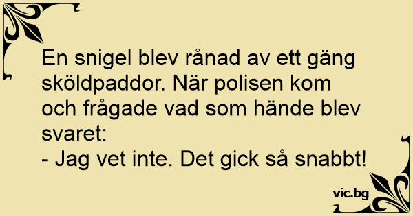 En snigel blev rånad av ett gäng sköldpaddor. När polisen kom och frågade vad som hände blev svaret: