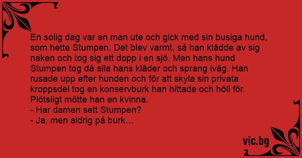 En solig dag var en man ute och gick med sin busiga hund, som hette Stumpen. Det blev varmt, så han klädde av sig naken och tog sig ett dopp i en sjö. Men hans hund Stumpen tog då alla hans kläder och sprang iväg. Han rusade upp efter hunden och för att skyla sin privata kroppsdel tog en konservburk han hittade och höll för. Plötsligt mötte han en kvinna.