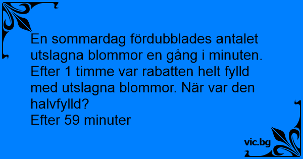 En sommardag fördubblades antalet utslagna blommor en gång i minuten. Efter 1 timme var rabatten helt fylld med utslagna blommor. När var den halvfylld?