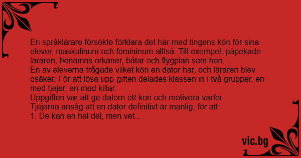 En av eleverna frågade vilket kön en dator har, och läraren blev osäker. För att lösa upp-giften delades klassen in i två grupper, en med tjejer, en med killar.