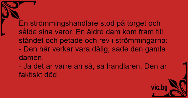 En strömmingshandlare stod på torget och sålde sina varor. En äldre dam kom fram till ståndet och petade och rev i strömmingarna: