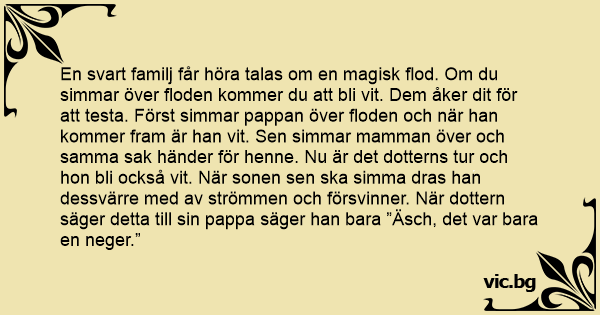 En svart familj får höra talas om en magisk flod. Om du simmar över floden kommer du att bli vit. Dem åker dit för att testa. Först simmar pappan över floden och när han kommer fram är han vit. Sen simmar mamman över och samma sak händer för henne. Nu är det dotterns tur och hon bli också vit. När sonen sen ska simma dras han dessvärre med av strömmen och försvinner. När dottern säger detta till sin pappa säger han bara ”Äsch, det var bara en nеgеr.”