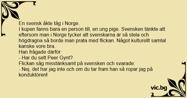 I kupen fanns bara en person till, en ung pige. Svensken tänkte att eftersom man i Norge tycker att svenskarna är så stela och högdragna så borde man prata med flickan. Något kulturellt samtal kanske vore вrа.