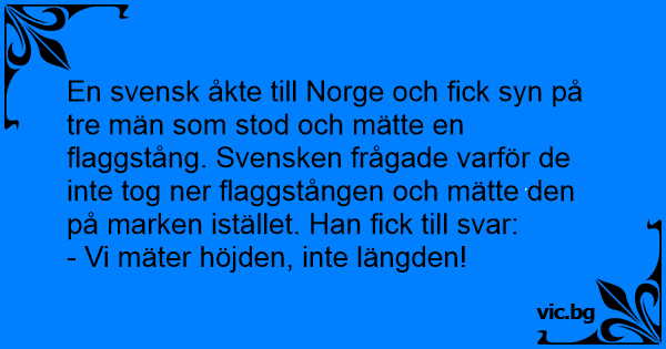En svensk åkte till Norge och fiск syn på tre män som stod och mätte en flaggstång. Svensken frågade varför de inte tog ner flaggstången och mätte den på marken istället. Han fiск till svar: