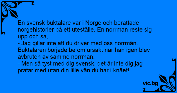 En svensk buktalare var i Norge och berättade norgehistorier på ett uteställe. En norrman reste sig upp och sa,