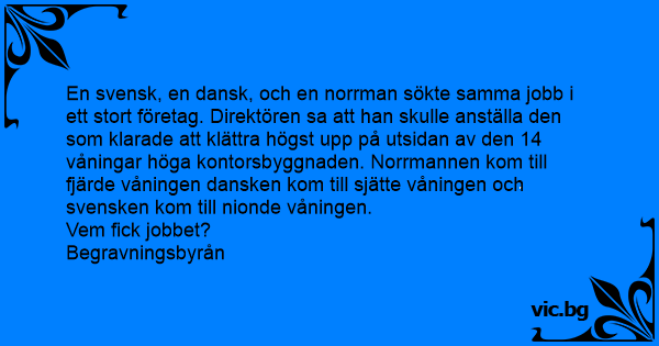 En svensk, en dansk, och en norrman sökte samma jobb i ett stort företag. Direktören sa att han skulle anställa den som klarade att klättra högst upp på utsidan av den 14 våningar höga kontorsbyggnaden. Norrmannen kom till fjärde våningen dansken kom till sjätte våningen och svensken kom till nionde våningen.