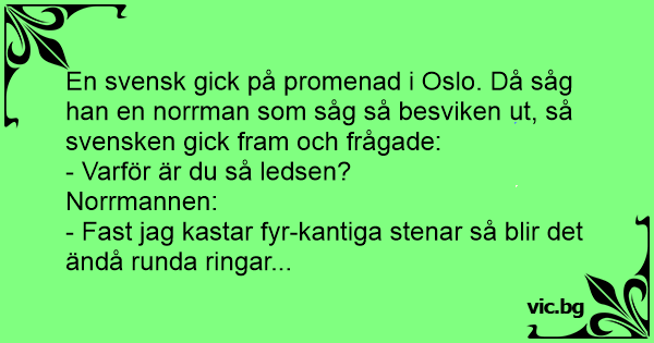 En svensk gick på promenad i Oslo. Då såg han en norrman som såg så besviken ut, så svensken gick fram och frågade: