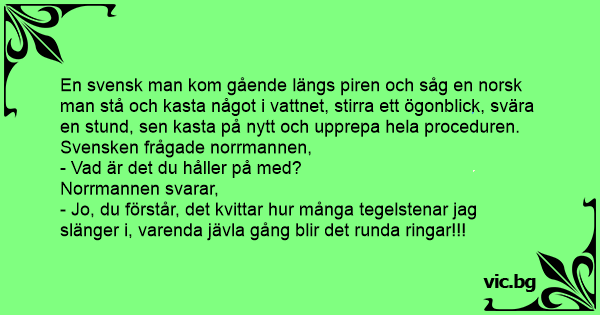En svensk man kom gående längs piren och såg en norsk man stå och kasta något i vattnet, stirra ett ögonblick, svära en stund, sen kasta på nytt och upprepa hela proceduren.