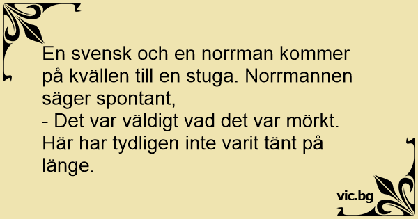 En svensk och en norrman kommer på kvällen till en stuga. Norrmannen säger spontant,
