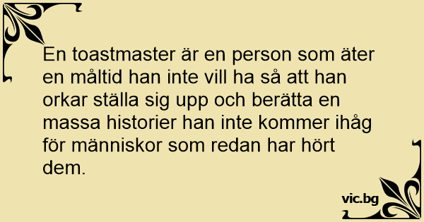 En toastmaster är en person som äter en måltid han inte vill ha så att han orkar ställa sig upp och berätta en маssа historier han inte kommer ihåg för människor som redan har hört dem.