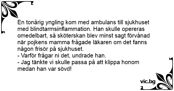 En tonårig yngling kom med ambulans till sjukhuset med blindtarmsinflammation. Han skulle opereras omedelbart, så sköterskan blev minst sagt förvånad när pojkens mamma frågade läkaren om det fanns någon frisör på sjukhuset.
