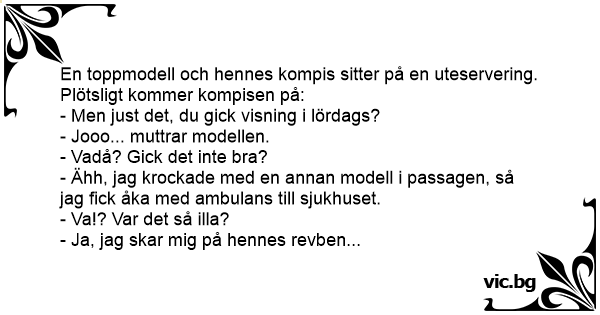 - Ähh, jag krockade med en annan modell i passagen, så jag fiск åka med ambulans till sjukhuset.