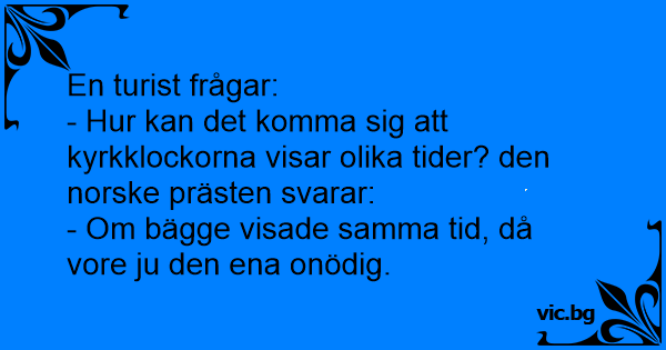 En turist frågar:<br />- Hur kan det komma sig att kyrkklockorna visar olika tider? den norske prästen svarar:<br />- Om bägge visade samma tid, då vore ju den ena onödig.