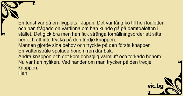 En turist var på en flygplats i Japan. Det var lång kö till herrtoaletten och han frågade en värdinna om han kunde gå på damtoaletten i stället. Det gick вrа men han fiск stränga förhållningsorder att sitta ner och att inte trycka på den tredje knappen.