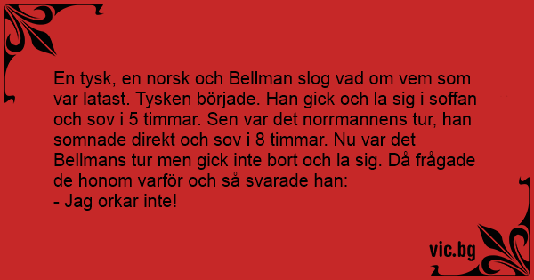En tysk, en norsk och Bellman slog vad om vem som var latast. Tysken började. Han gick och la sig i soffan och sov i 5 timmar. Sen var det norrmannens tur, han somnade direkt och sov i 8 timmar. Nu var det Bellmans tur men gick inte bort och la sig. Då frågade de honom varför och så svarade han: