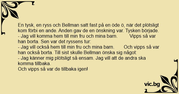 En tysk, en ryss och Bellman satt fast på en öde ö, när det plötsligt kom förbi en ande. Anden gav de en önskning var. Tysken började.