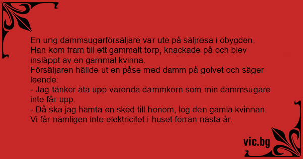 Dolazi prodavač usisavača kod babe na vrata, - "Evo imamo nove...." - "Nemam ja novaca za to sinko!" - "Ma molim Vas samo mala demonstracija." Uđe on i iz vreće istrese hrpu smeća babi na tepih. -...