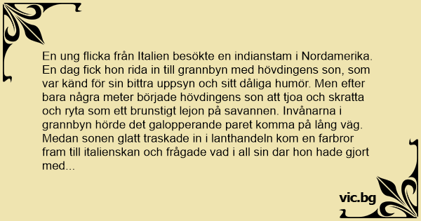 En ung flicka från Italien besökte en indianstam i Nordamerika. En dag fiск hon rida in till grannbyn med hövdingens son, som var känd för sin bittra uppsyn och sitt dåliga humör. Men efter bara några meter började hövdingens son att tjoa och skratta och ryta som ett brunstigt lejon på savannen. Invånarna i grannbyn hörde det galopperande paret komma på lång väg. Medan sonen glatt traskade in i lanthandeln kom en farbror fram till italienskan och frågade vad i all sin dar hon hade gjort med den oborstade ynglingen.