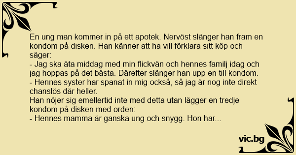 En ung pojke går ett apotek och apotekaren säger: - Hej, kan du ge mig en kondom. Min flickvän bjöd mig på middag ikväll och jag tror att hon förväntar sig något från mig. Farmaceuten ger honom...