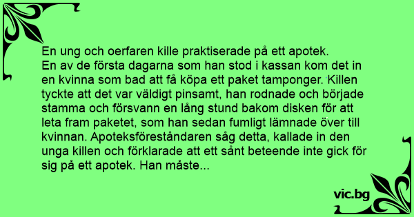 En av de första dagarna som han stod i kassan kom det in en kvinna som bad att få köpa ett paket tamponger. Killen tyckte att det var väldigt pinsamt, han rodnade och började stamma och försvann en lång stund bakom disken för att leta fram paketet, som han sedan fumligt lämnade över till kvinnan. Apoteksföreståndaren såg detta, kallade in den unga killen och förklarade att ett sånt beteende inte gick för sig på ett apotek. Han måste skärpa till sig omedelbart, och bete sig naturligt och avslappnat mot kunderna.