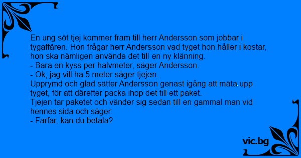 En ung söt tjej kommer fram till herr Andersson som jobbar i tygaffären. Hon frågar herr Andersson vad tyget hon håller i kostar, hon ska nämligen använda det till en ny klänning.