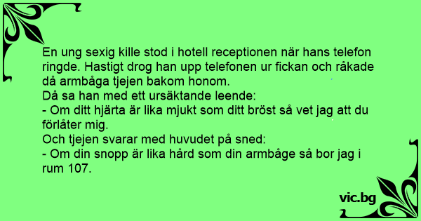 В асансьор на хотел без да иска мъж удря с лакът в гърдите млада дама. - Ох, извинете! Ако сърцето ви е толкова меко и топло колкото гърдите ви, ще ми простите... - Ако онази ви работа е толкова твърда, колкото и лакътя ви, то тогава сте поканен в моята стая - номер 324... - му отговаря тя.