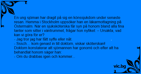 En ung sjöman har dragit på sig en könssjukdom under senaste resan. Hemma i Stockholm uppsöker han en läkarmottagning på Östermalm. När en sjuksköterska får syn på honom bland alla fina tanter som sitter i väntrummet, frågar hon nyfiket: – Ursäkta, vad kan vi göra för er?