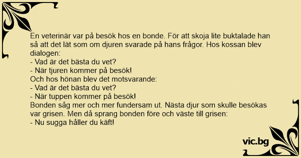 En veterinär var på besök hos en bonde. För att skoja lite buktalade han så att det lät som om djuren svarade på hans frågor. Hos kossan blev dialogen:
