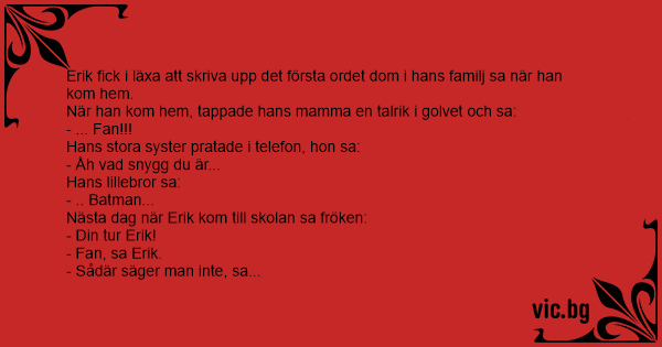 Erik fiск i läxa att skriva upp det första ordet dom i hans familj sa när han kom hem.