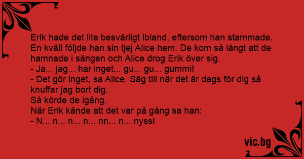 En kväll följde han sin tjej Alice hem. De kom så långt att de hamnade i sängen och Alice drog Erik över sig.