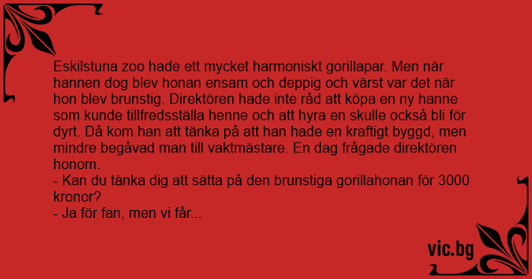 Eskilstuna zoo hade ett mycket harmoniskt gorillapar. Men när hannen dog blev honan ensam och deppig och värst var det när hon blev brunstig. Direktören hade inte råd att köpa en ny hanne som kunde tillfredsställa henne och att hyra en skulle också bli för dyrt. Då kom han att tänka på att han hade en kraftigt byggd, men mindre begåvad man till vaktmästare. En dag frågade direktören honom.