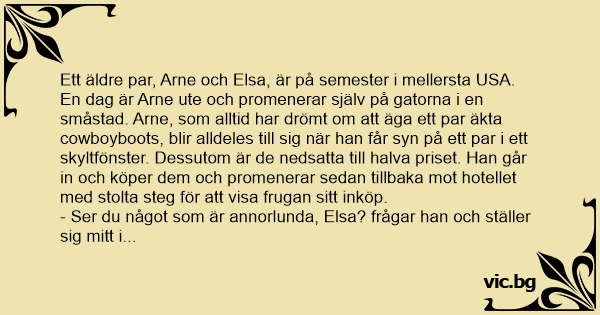 Ett äldre par, Arne och Elsa, är på semester i mellersta USA. En dag är Arne ute och promenerar själv på gatorna i en småstad. Arne, som alltid har drömt om att äga ett par äkta cowboyboots, blir alldeles till sig när han får syn på ett par i ett skyltfönster. Dessutom är de nedsatta till halva priset. Han går in och köper dem och promenerar sedan tillbaka mot hotellet med stolta steg för att visa frugan sitt inköp.
