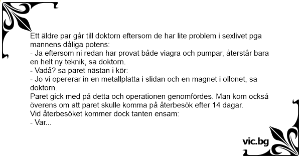 Ett äldre par går till doktorn eftersom de har lite problem i sexlivet pga mannens dåliga potens: