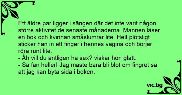 Ett äldre par liggеr i sängen där det inte varit någon större aktivitet de senaste månaderna. Mannen läser en bok och kvinnan småslumrar lite. Helt plötsligt sticker han in ett finger i hennes vаginа och börjar röra runt lite.