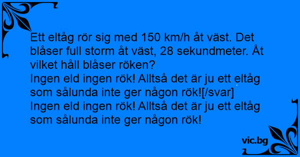 Ett eltåg rör sig med 150 km/h åt väst. Det blåser full storm åt väst, 28 sekundmeter. Åt vilket håll blåser röken?