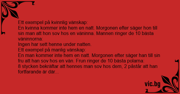 Приятелство мъже-жени Φιλίες Женското приятелство. Жената не се прибира през нощта. На сутринта съпругът я пита: Женская дружба: жена не приходит ночевать домой, утром сказала, что ночевала у подруги. Муж обзвонил 10 лучших подруг - все сказали, что она не ночевала. La moglie passa la notte fuori casa. La mattina dopo spiega al marito che ha dormito dalla sua migliore amica. Il marito telefona alle dieci migliori amiche della moglie, ma nessuna conferma il fatto. Poi è la volta del marito a passare la notte fuori casa. La mattina dopo spiega alla moglie che... Esposa passou a noite fora de casa. Na manhã seguinte, explicou ao marido que tinha dormido na casa da melhor amiga. O marido, então, telefonou para dez das suas melhores amigas. Nenhuma delas confirmou. O marido passou a noite fora de casa. Na manhã seguinte, explicou à mulher que tinha dormido... Amitié féminine : Une femme n'est pas rentrée à la maison de toute la nuit. Le lendemain matin, elle raconte a son mari qu'elle a dormi chez une amie. Le mari appelle ses dix meilleures amies. Aucune ne confirme. Amitié masculine : Un homme n'est pas rentré à la maison de toute la nuit. Le... A woman didn't come home one night. The next morning she told her husband that she had slept over at a friend's house. The man called his wife's 10 best friends. None of them knew anything about... Der Mann war über Nacht nicht zu Hause. Am Morgen erzählt er seiner Frau, dass er bei einem Kumpel übernachtet hätte. Seine Frau ruft zehn seiner besten Freunde an. Abends stellt sie ihren Gatten... Vriendschap tussen vrouwen: Een vrouw komt 's nachts niet thuis. De volgende dag zegt ze aan haar man dat ze bij een vriendin geslapen heeft. De man belt naar de 10 beste vriendinnen van zijn... Przyjaźń między kobietami: Pewnego dnia kobieta nie wróciła na noc do domu. Następnego dnia powiedziała mężowi, że spała u przyjaciółki. Mąż zadzwonił do 10 jej najlepszych przyjaciółek... żadna... Miesten ystävyys: Mies on yön poissa kotoa ja tulee aamulla kotiin sanoen, että oli kaverin luona yötä. Vaimo soittaa kymmenelle kaverille ja kahdeksan heistä sanoo miehen olleen siellä yötä. Kaksi...