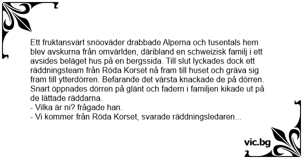 Ett fruktansvärt snöoväder drabbade Alperna och tusentals hem blev avskurna från omvärlden, däribland en schweizisk familj i ett avsides beläget hus på en bergssida. Till sluт lyckades dock ett räddningsteam från Röda Korset nå fram till huset och gräva sig fram till ytterdörren. Befarande det värsta knackade de på dörren.