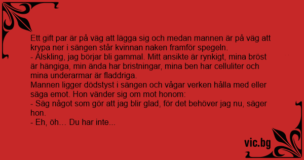 Mannen liggеr dödstyst i sängen och vågar verken hålla med eller säga emot. Hon vänder sig om mot honom: