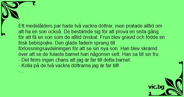 Ett medelålders par hade två vackra döttrar, men pratade alltid om att ha en son också. De bestämde sig för att prova en sista gång för att få en son som de alltid önskat. Frun blev gravid och födde en frisk bebispojke. Den glade fadern sprang till förlossningsavdelningen för att se sin nya son. Han blev skrämd över att se de fulaste barnet han någonsin sett. Han sa till sin fru: