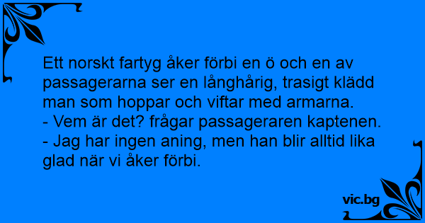 Κρουαζιερόπλοιο. Минава кораб покрай остров насред океана. Един човек пътувал с кораб. Fartygspassagerare till kaptenen: - Vem är det som springer runt, hoppar och vinkar på den där lilla ön som vi just passerade? - Jag vet faktiskt inte, men han är lika glad var gång vi åker förbi. Um navio de passageiros está navegando numa boa em alto mar, quando de repente numa ilha, um homem barbudo pula que nem louco, grita, esperneia e não para um minuto de fazer gestos para a... Det stora fartyget passerar en öde ö. En passagerare ser en trasigt klädd man som hoppar omkring och viftar med armarna. – Vem är det där? Frågar han kaptenen. – Jag vet inte, men han blir lika... Ένα υπερπολυτελές κρουαζιερόπλοιο, καθώς διαπλέει την Καραϊβική, περνά μπροστά από ένα έρημο νησάκι. Σε μια παραλία του νησιού ξαφνικά εμφανίζεται ένας ταλαιπωρημένος, κουρελιασμένος ναυαγός, ο...