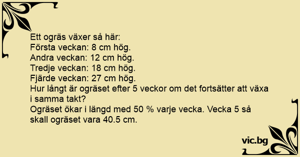 Ogräset ökar i längd med 50 % varje vecka. Vecka 5 så skall ogräset vara 40.5 cm.