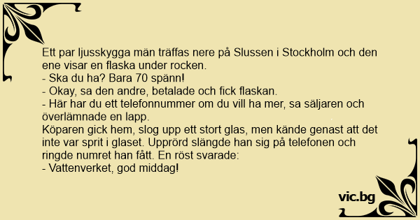 Köparen gick hem, slog upp ett stort glas, men kände genast att det inte var sprit i glaset. Upprörd slängde han sig på telefonen och ringde numret han fått. En röst svarade: