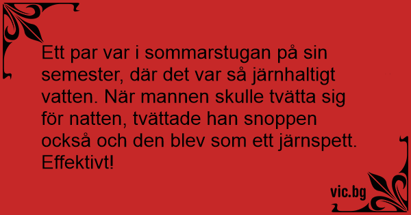 Ett par var i sommarstugan på sin semester, där det var så järnhaltigt vatten. När mannen skulle tvätta sig för natten, tvättade han snoppen också och den blev som ett järnspett. Effektivt!