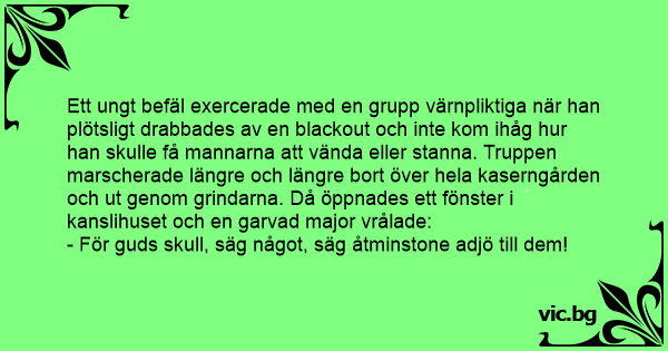 Ett ungt befäl exercerade med en grupp värnpliktiga när han plötsligt drabbades av en blackout och inte kom ihåg hur han skulle få mannarna att vända eller stanna. Truppen marscherade längre och längre bort över hela kaserngården och ut genom grindarna. Då öppnades ett fönster i kanslihuset och en garvad major vrålade: