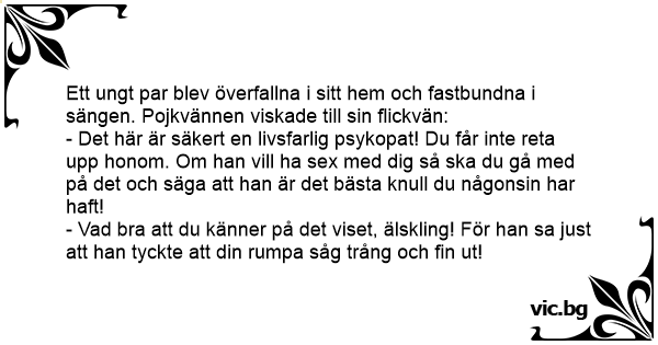 Et ægtepar bliver overrumplet at en indbrudstyv. Han binder dem til sengen og bøjer sig ned og kysser kvinden på kinden. Derefter går han ud på badeværelset. Manden siger til konen: Jeg så godt han...