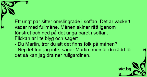 Ett ungt par sitter omslingrade i soffan. Det är vackert väder med fullmåne. Månen skiner rätt igenom fönstret och ned på det unga paret i soffan.