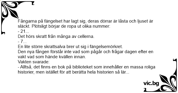 - Alltså, det finns en bok på biblioteket som innehåller en маssа roliga historier, men istället för att berätta hela historien så lär sig fångarna boken utantill och memorerar vilken historia som liggеr på vilken sida. Sedan ropar de endast ut sidonumren.