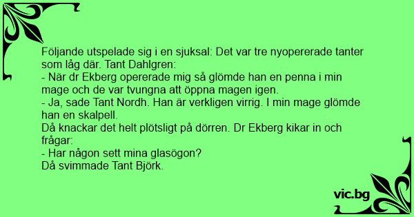 Följande utspelade sig i en sjuksal: Det var tre nyopererade tanter som låg där. Tant Dahlgren: