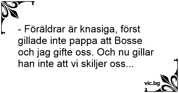 - Föräldrar är knasiga, först gillade inte pappa att Bosse och jag gifte oss. Och nu gillar han inte att vi skiljer oss...